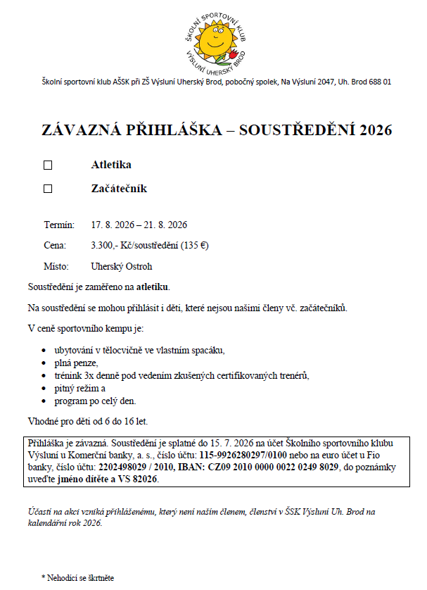 Soustředění ATLETIKA, 17. – 21. 8. 2026